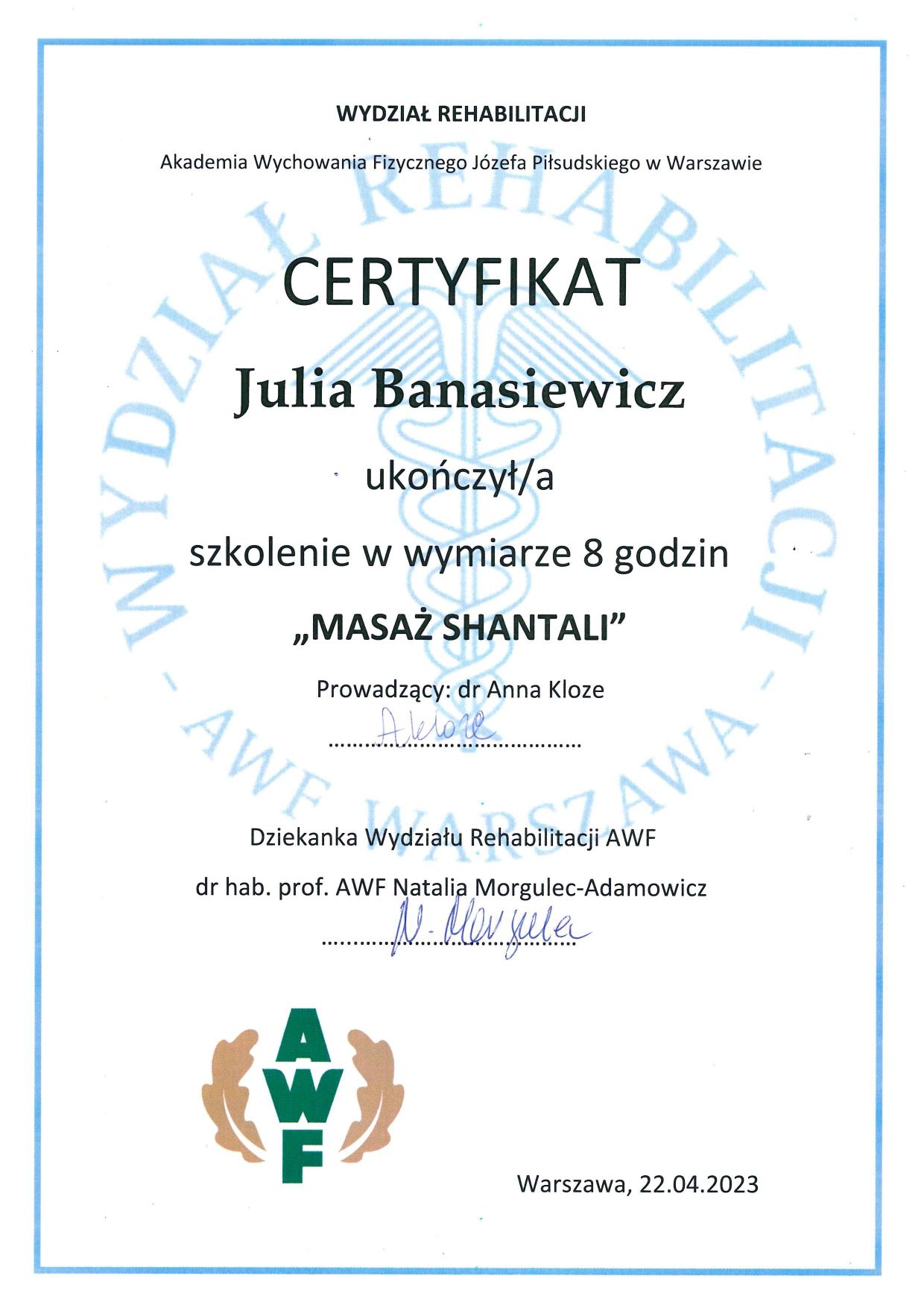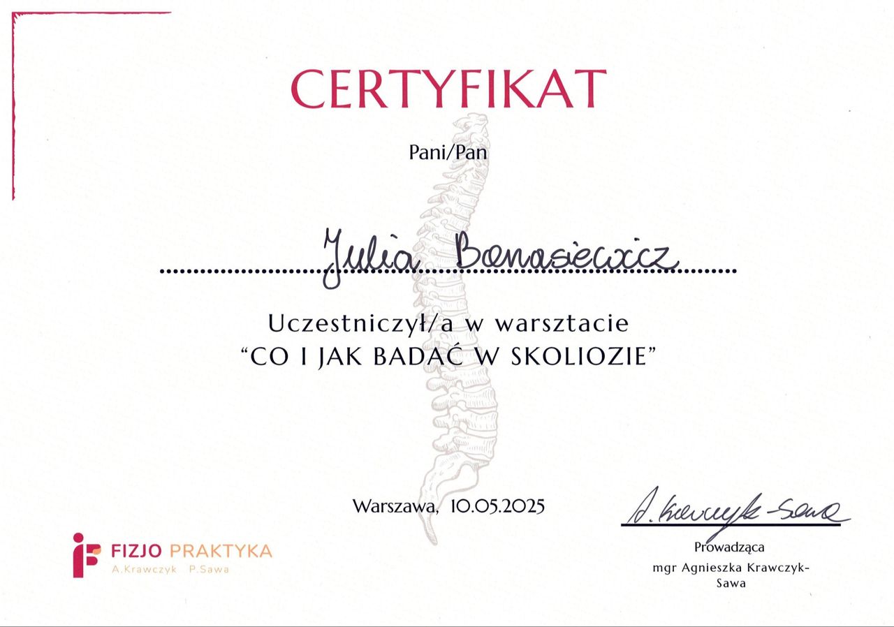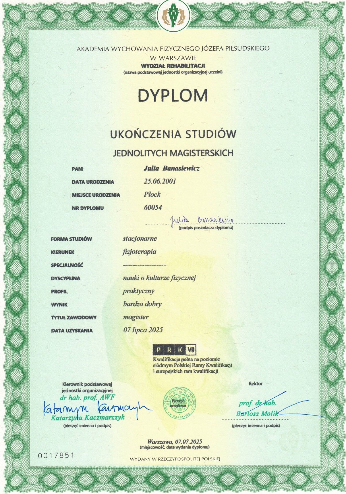 Jestem absolwentką Akademii Wychowania Fizycznego w Warszawie na kierunku Fizjoterapia. Aktualnie kontynuuję kształcenie na studiach podyplomowych "Fizjoterapia dna miednicy" na Gdańskim Uniwersytecie Medycznym, dzięki czemu rozwijam specjalistyczne kompetencje w obszarze zdrowia kobiet.