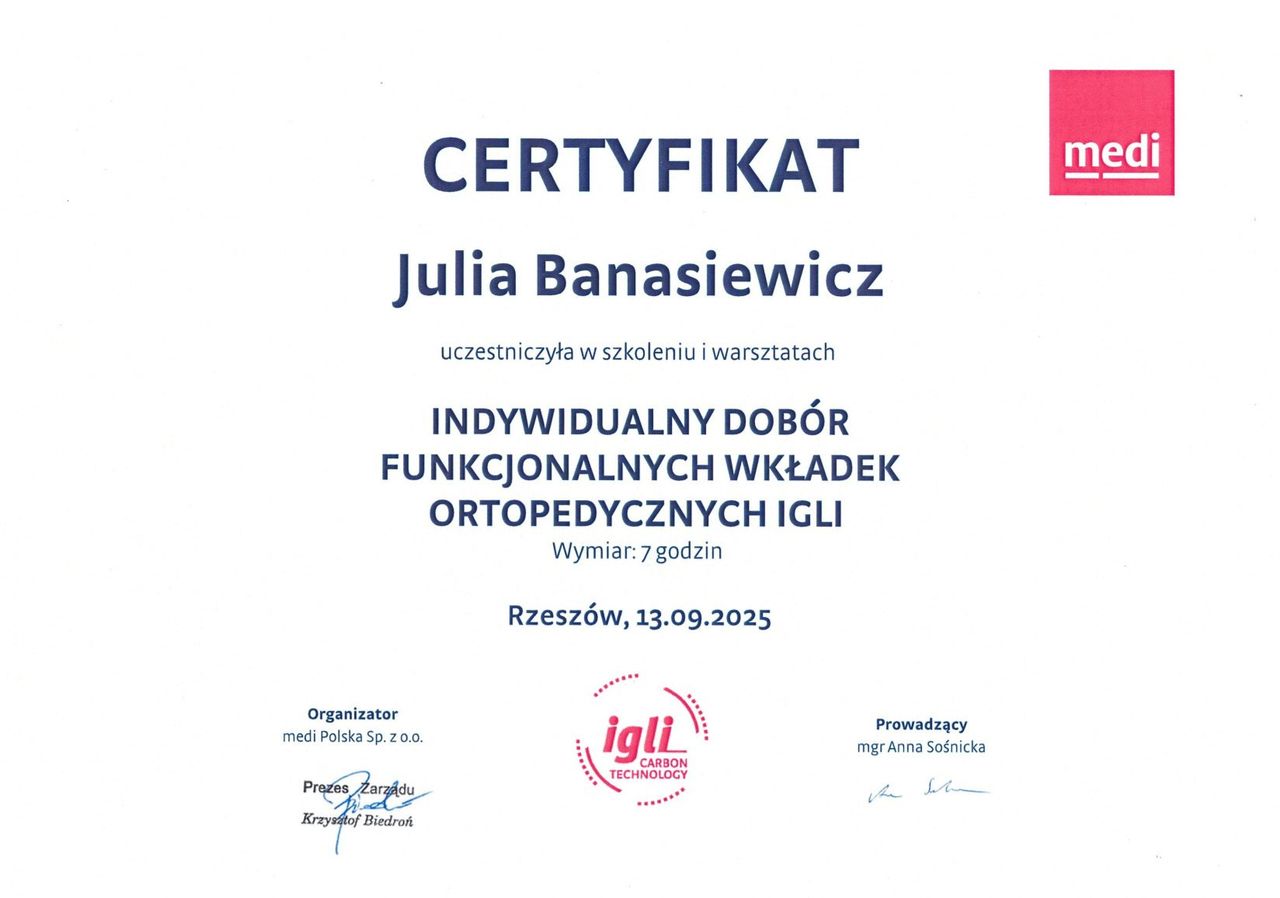 - Certyfikowany terapeuta w zakresie doboru Indywidualnych Funkcjonalnych Wkładek Ortopedycznych I Sensomotorycznych IGLI
