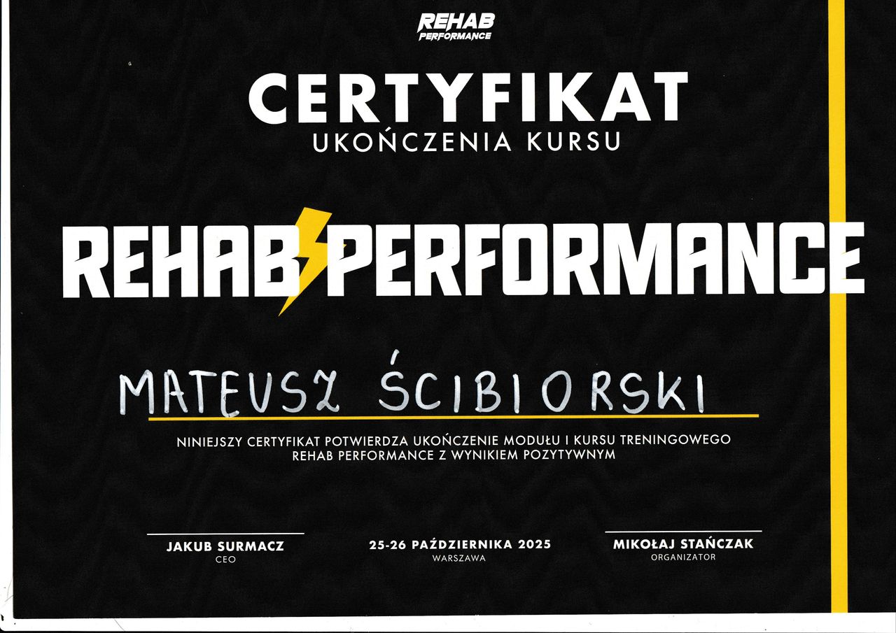 - Certyfikat ukończenie modułu kursu treningowego Rehab Performance