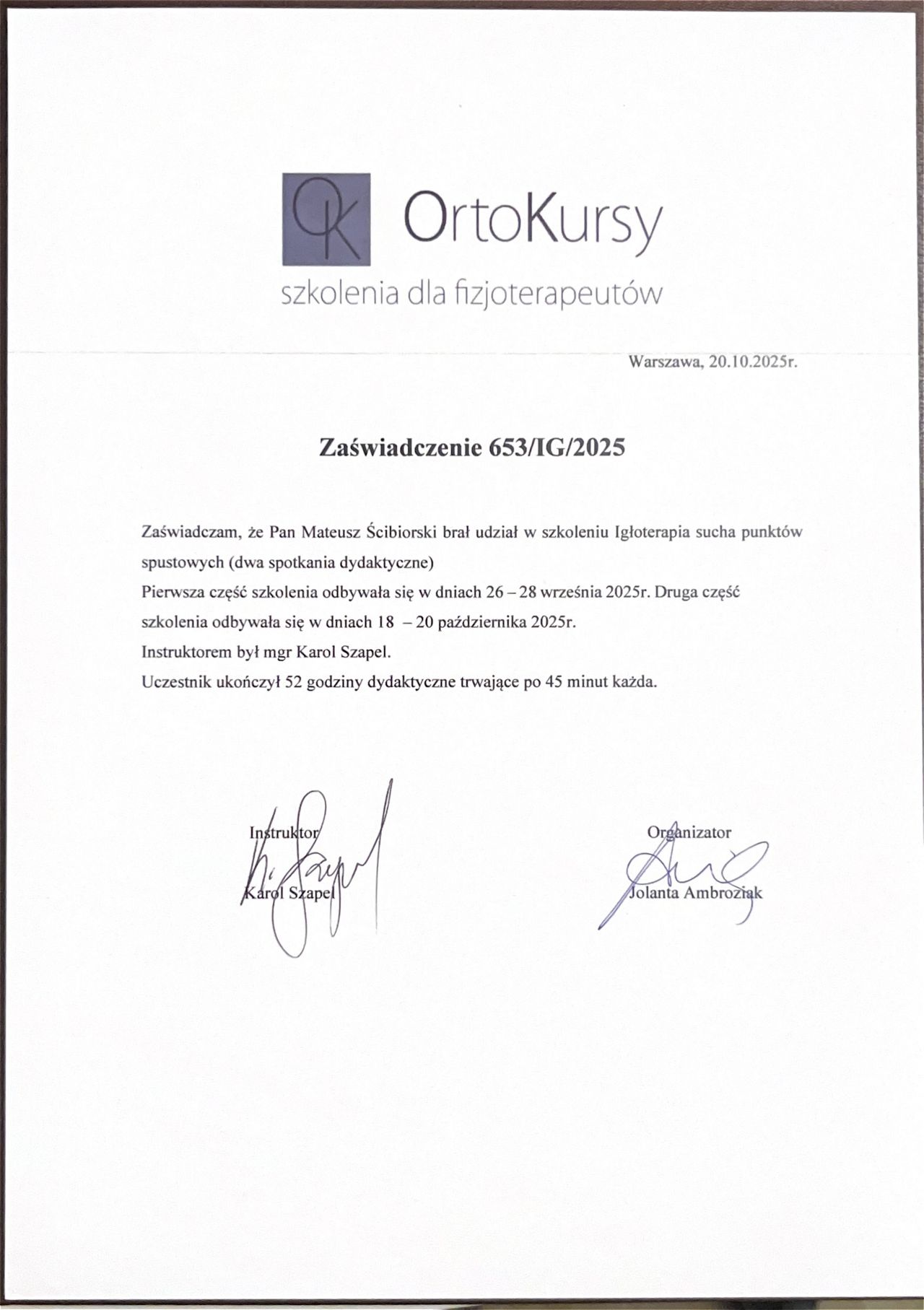 - Zaświadczenie ukończenia szkolenia, Igłoterapia sucha punktów spustowych