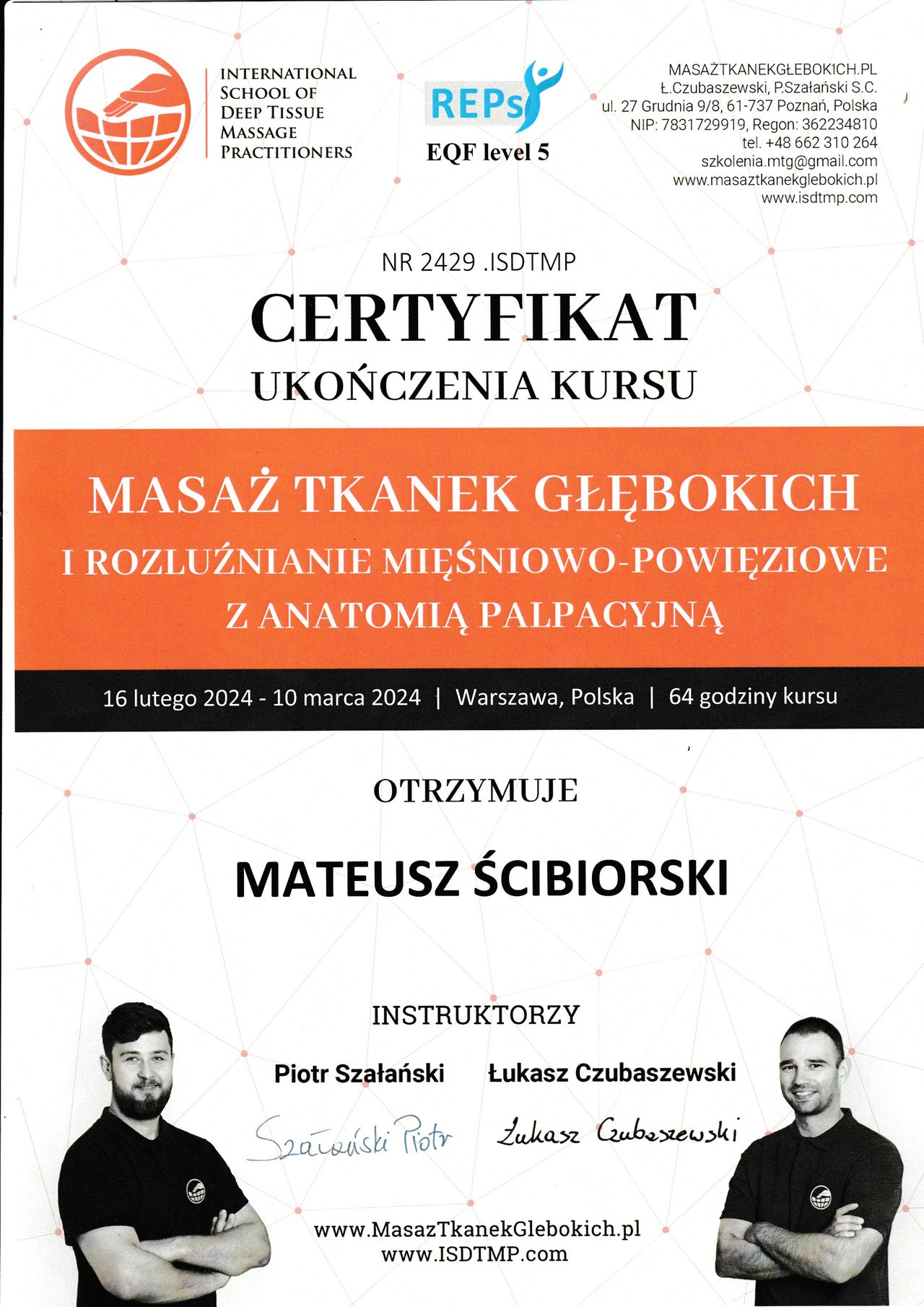 - Certyfikat Masaż tkanek głębokich i rozluźnianie mięśniowo‑powięziowe z anatomią palpacyjną